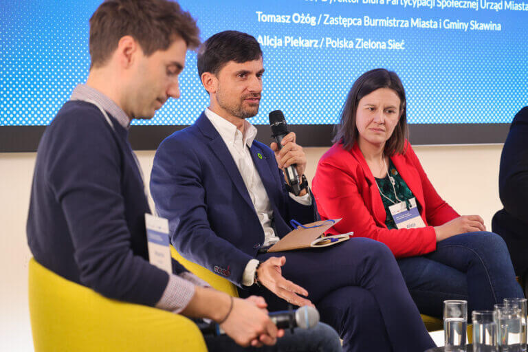 Drugą dyskusję panelową poprowadził Marcin Górecki (Fundacja Stocznia). W panelu Współpraca, która napędza zmianę. Jak samorządy i NGO wspierają się w procesie zielonej transformacji społeczności lokalnych? udział wzięli Patryk Białas (Bo Miasto), Tomasz Ożóg (Zastępca Burmistrza Miasta i Gminy Skawina), Alicja Piekarz (Polska Zielona Sieć).